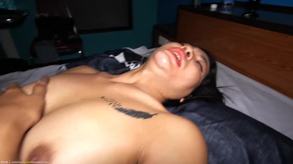 Description: Femboy Duan s backdoor on her pajamas are unbuttoned revealing her hairless cock and tight asshole for a topping and bottoming bareback creampie 3x cum session. Duan s sleeping outfit is made up of cute pink hearts and even has a tail. But the best part is the rear can be easily opened to access her delicious Femboy bits for pleasure. It s easy to tell Duan is horny with her hard cock outlined beneath the thin material of the pj s. The older man bends over Duan and admires her smooth nubile backside. Her tiny wrinkled butthole feeling the man s erection rubbing against the winking hole. The man fingers Duan s precious anus then slides in his cock just a little to warm her up. She s extremely tight and the man presents his cock to Duan s lips to lube with saliva. Duan pumps the meat and swirls her tongue around the shaft. She plays with the man s backdoor while she sucks and her erection wants to slide into the guy. Duan grips the man s dick and pounds her lovely unprotected cock into the older POV man. POV views from the guy and wide shots of Duan s thrusting from the rear as she fills the man with her uncut Thai meat. Duan slurps more on the man s dick then uses a red buttplug to train her back pussy. As she stretches herself more the man feeds Duan his cock and spit. Duan loves rough sex and is in heaven when the man sits his butthole right on her mouth. Duan inhales the man s shitter jerking herself off mindlessly in search of her climax. Duan is manhandled and this makes her cum with her balls emptying a creamy load and fed to her lips. The man next lays Duan back. He oils her lovely flat chest and feels the tightness of her squeezing sphincter. It doesn t take long and the man bathes Duan s insides and loins with a hot creampie. The cock reinserts to breed Duan then brought to her lips to clean off the spent shaft. She licks the man clean then goes into the shower with the man watching. Seeing this lithe Femboy glistening in the shower gets the man hard again. Duan dresses in a black dress and red stripped panties and notices the guys erection. She drops to her knees to give rimming sucking ball pleasing handjob and cocksucking pleasure. The man is ready to cum and Duan opens her mouth to receive the second load of jizz straight from the source. Duan swallows the load of semen to complete this 3 popshot barebacking session. Experience Duan exclusively on LadyboysFuckedBareback anbd the LadyboyGold Network.
